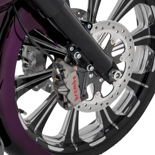 Stilvolles Design mit 23 Zoll vorn und 18 Zoll hinten. Mit schlanken Radspeichen, die sich bis zum Felgenrand erstrecken