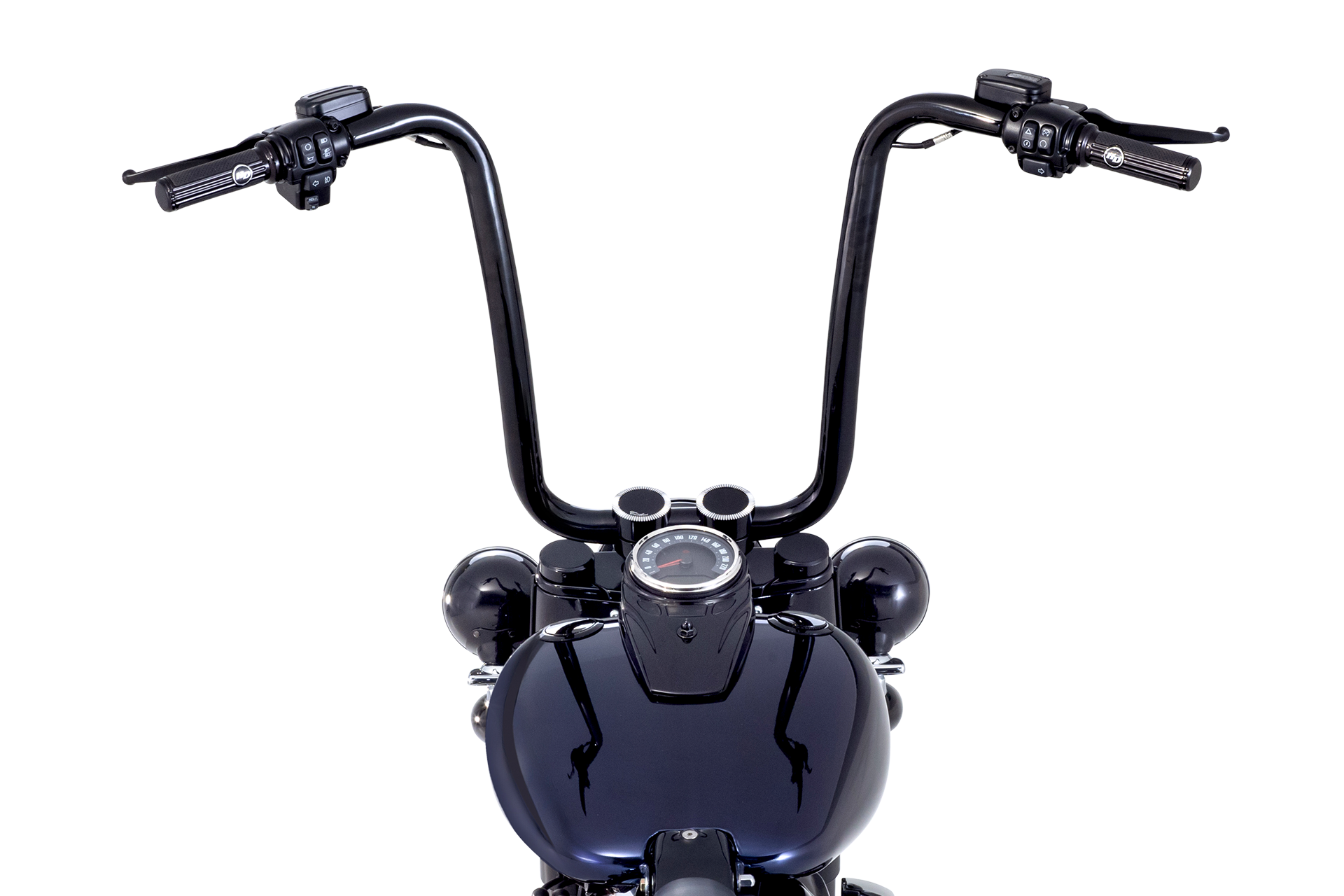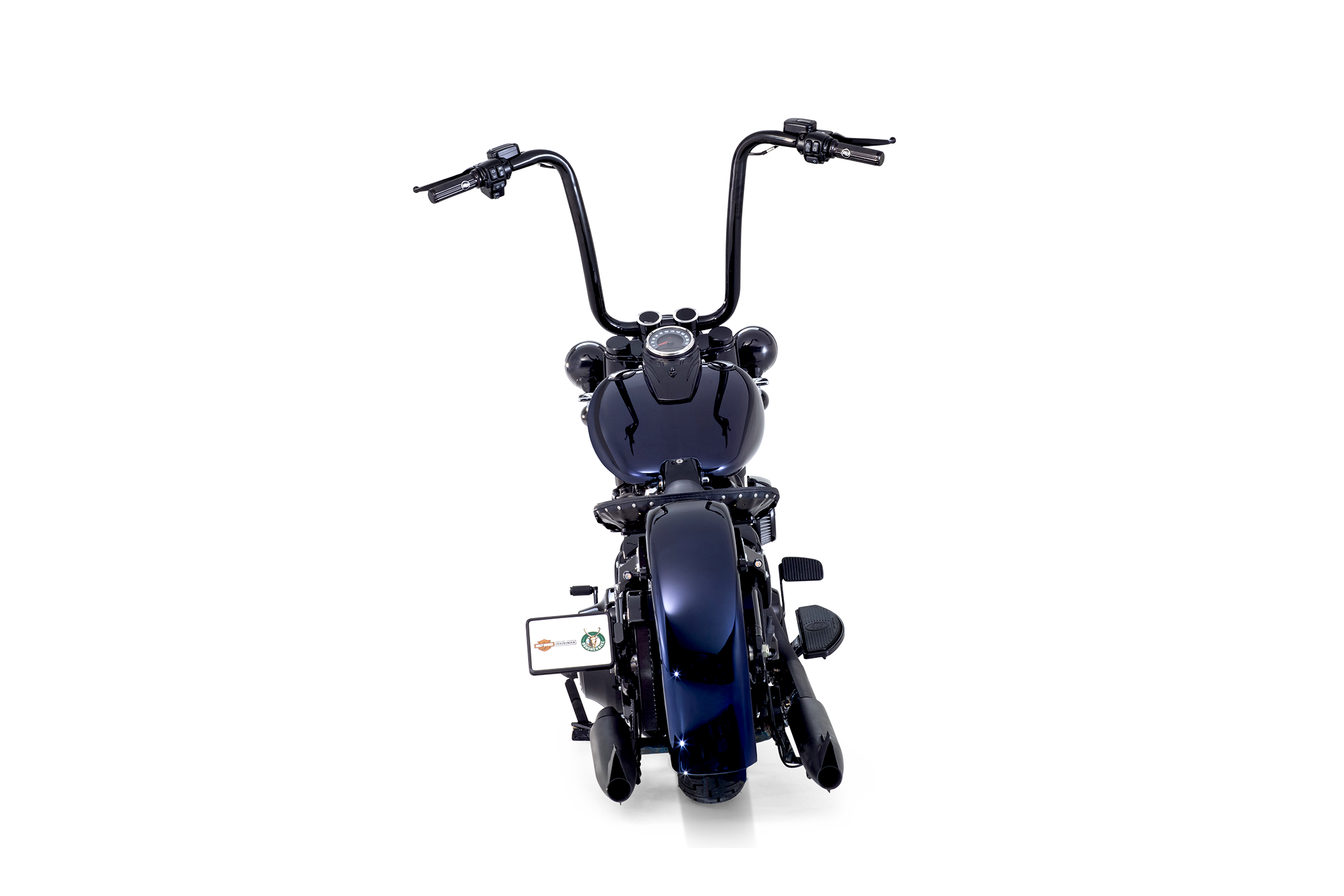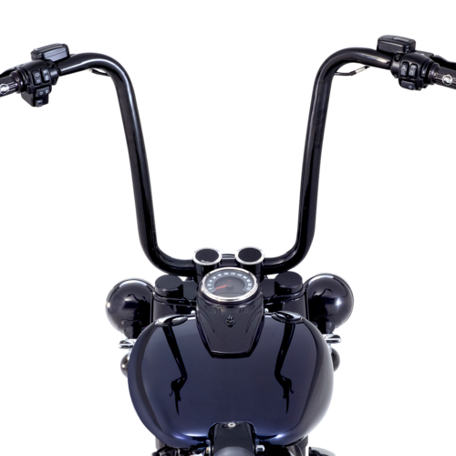 - Original Harley-Davidson Ape Hanger Lenker, kombiniert mit schwarzen Risern und klassischen H-D Griffen – für den typischen hohen, entspannten Chicano-Fahrstil.
